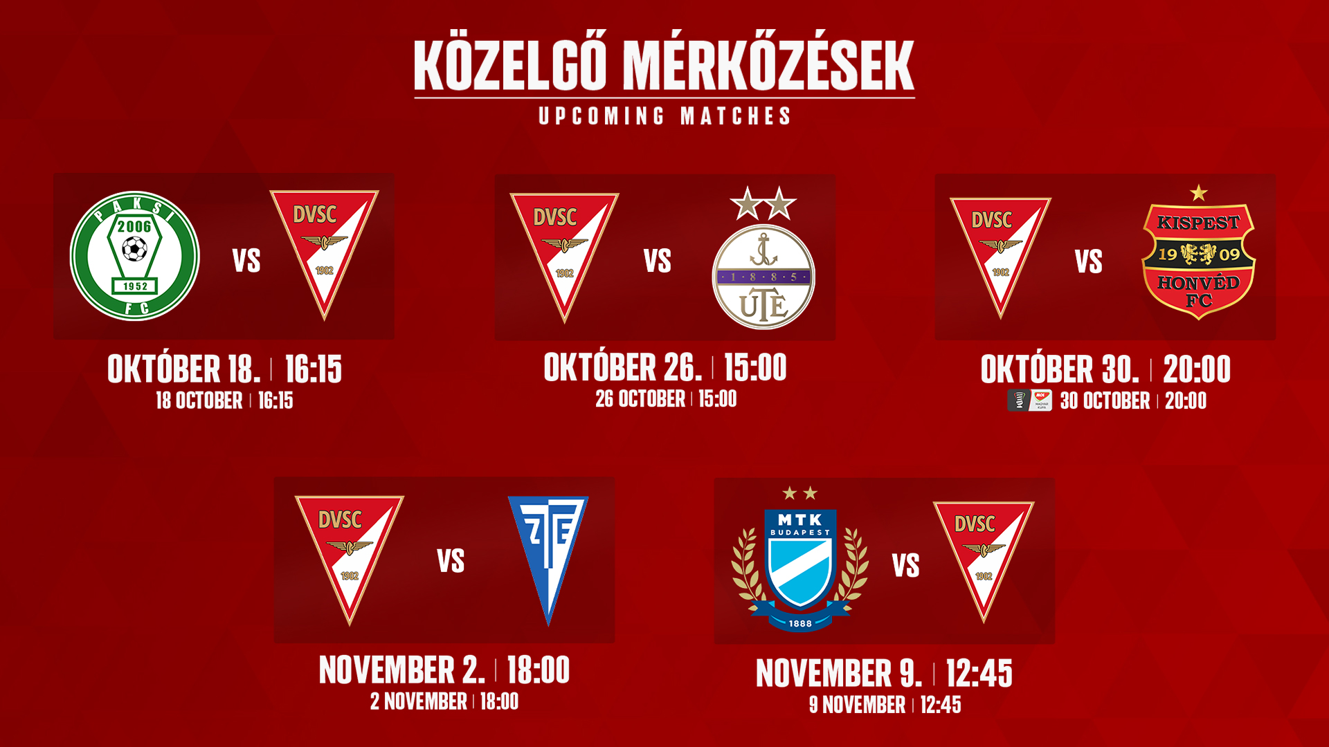 Rangadóval folytatja a bajnokságot a négy forduló óta veretlen, jól szereplő DVSC, amely vasárnap 15 órakor az Újpestet fogadja a Nagyerdei Stadionban a Fizz Liga 11. fordulójában.