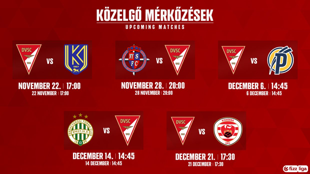 Csapatunk a válogatott szünet után, november 22-én, szombaton 17 órától fogadja a Kazincbarcikát a Nagyerdei Stadionban, majd november 28-án, pénteken 20 órától lép pályára Nyíregyházán.