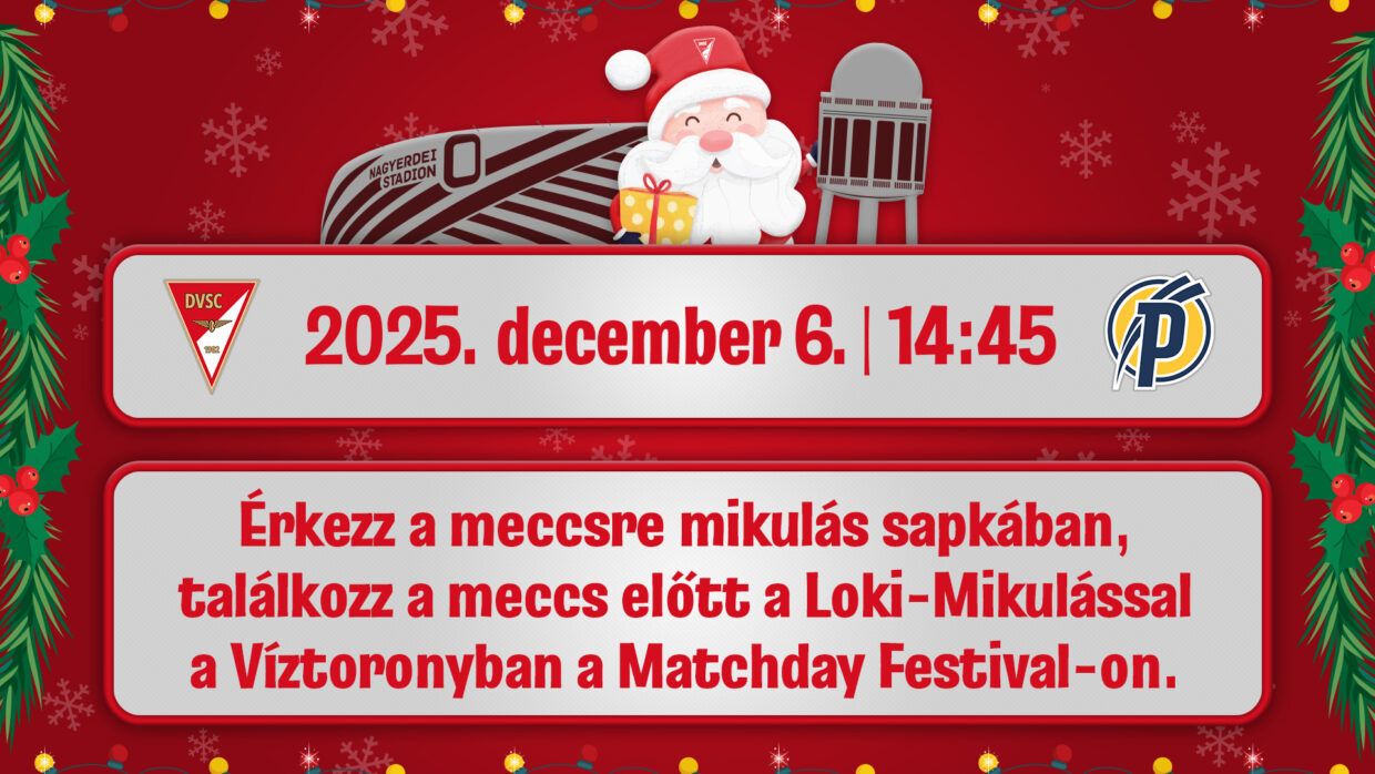 December 6-án a Puskás Akadémiát fogadja csapatunk a stadionban, na de nemcsak a felcsútiak érkeznek a Nagyerdőre, hanem a Loki-Mikulás is! Szuper programokkal készülünk, ezért érdemes már a mérkőzés előtt kilátogatni a Víztoronyba a Matchday Festival-ra, ahol találkozhatsz a Loki-Mikulással és értékes nyereményeket is nyerhetsz!